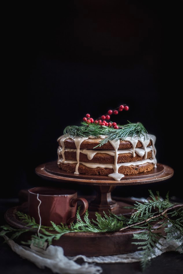 Note: The garnish on top of the cake is not edible, they’re seasonal sprigs of winterberry, douglas fir, and pine (I got them in a bouquet from Trader Joe’s). If you decide to garnish with them or something similar, you should remove them immediately before slicing the cake.