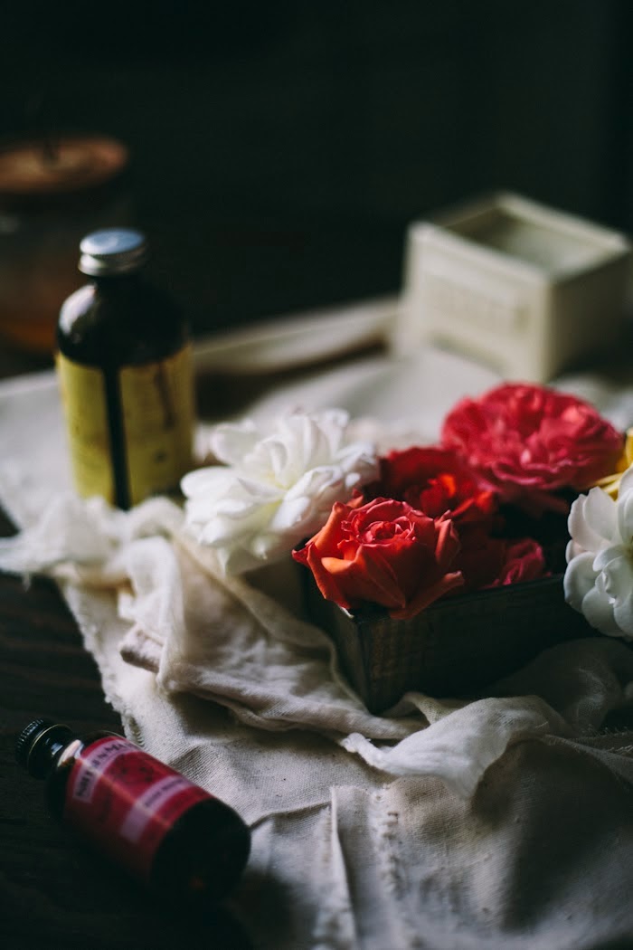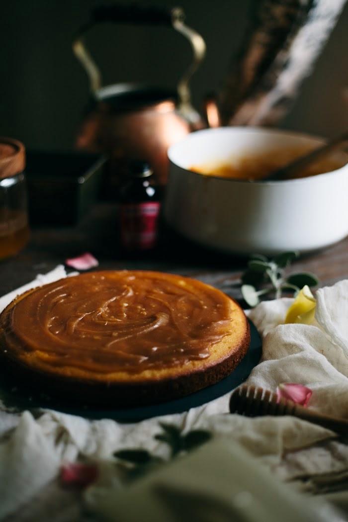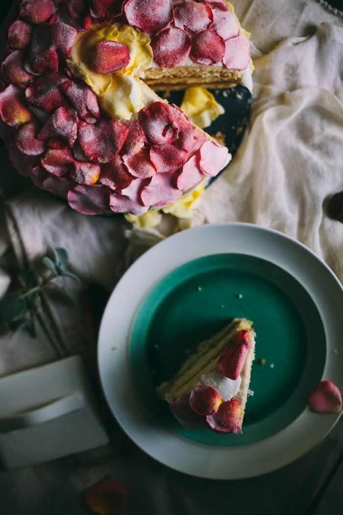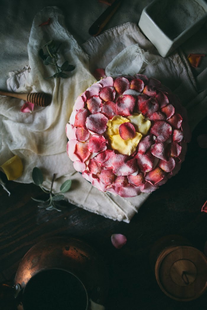I’ve been readying my garden for the event and in a few weeks it should be full of greenery, blossoms, and wonderful floral smells. New growth is just starting to come through on my rose bushes, so I wasn’t able to use their flowers for this cake, but I was able to snag some organic roses from the farmer’s market to incorporate into it. The cake itself is a wonderfully light vanilla cake, flavored with rose water, and with salted caramel thickly spread between the three layers. I made a honey vanilla buttercream to coat the outside, and candied some rose petals for the exterior (this is totally optional, candying this amount of rose petals takes a realllly long time, and while they do add a great presentation factor, the cake would taste just as awesome without them).