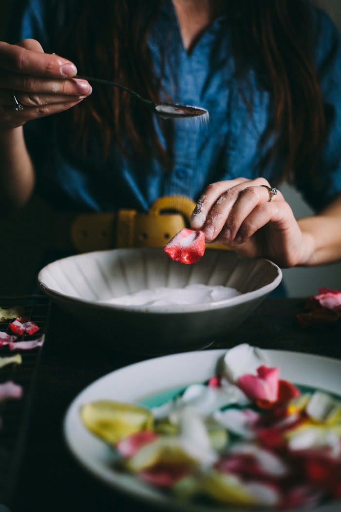 While the cakes are cooling, you can begin candying the rose petals (optional). Lightly brush each petal with the egg white until it is completely coated in a thin layer of egg wash. Take a small spoon and gently sprinkle the caster's sugar over the petal until it is coated with the sugar all around. Place on a wire rack to dry until crisp, repeat with the remaining rose petals.