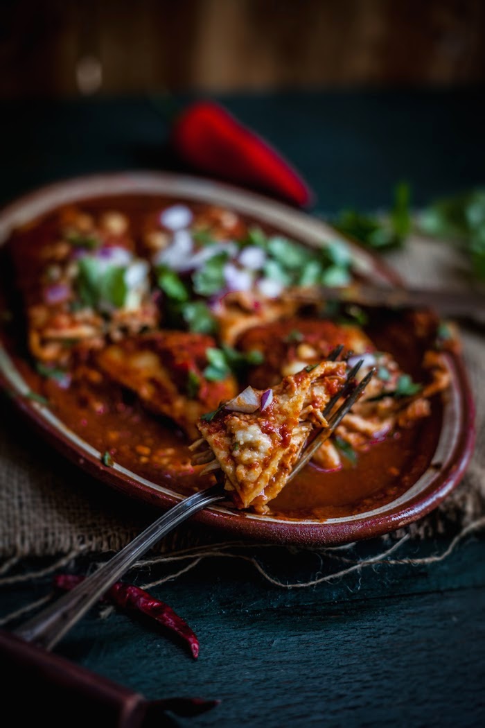 Love your enchiladas. I do red chile enchiladas, too and always dip first. The other key is to bake them right away so they don't fall apart. I don't let mine sit in the fridge and then bake for later! My pictures are not even close to yours but they sure taste good. Can't wait to try your version. Hope you are out of the winter doldrums!