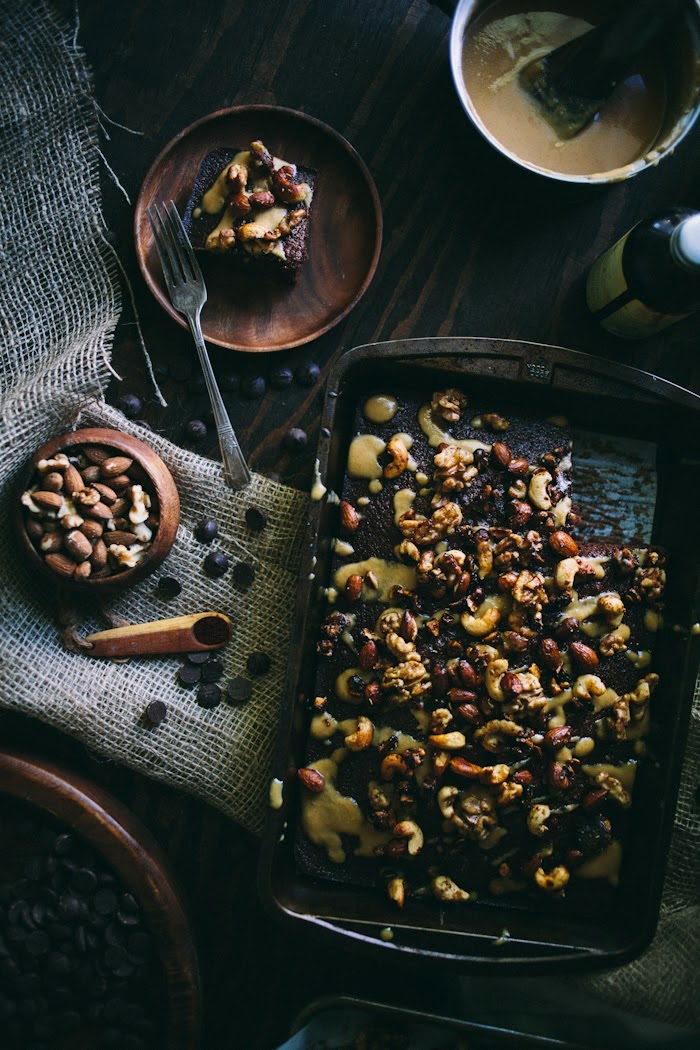 Sheet cakes are one of the most unassuming desserts, but you always make them look SO beautiful and delicious! I think Brianne's description of "approachable" is perfect. (I love making layer cakes, but I need to get myself into a LET'S SHOW THIS CAKE WHO'S BOSS mindset.) There's just something wonderful about the ease of baking a sheet cake, topping it with a whole lot of pretty, scrumptious things, and then letting the flavor speak for itself. I love that you used chile powder for the cake and tabasco for the nuts!