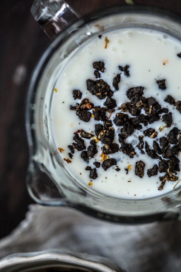 1. Begin by making the donuts. Bring the 3/4 cup milk to a boil and add the oolong tea. Lower the heat and simmer for 10 minutes, then remove from heat and allow to cool for 1 hour.
