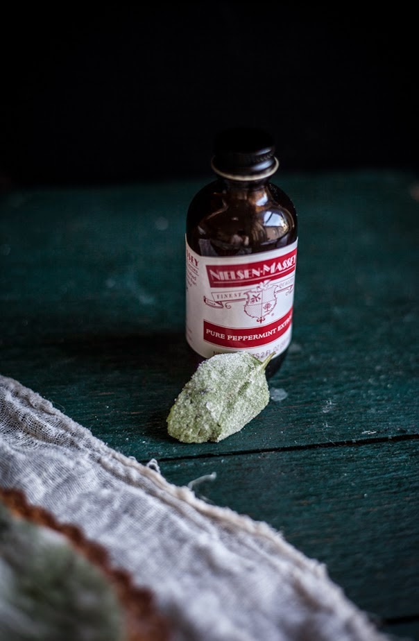 Look at all those beautiful candied mint leaves!! Sugar coated herbs are so reminiscent of frosted, snowy things — I love it. (They are rather tedious to make though, aren't they? 🙂 Still totally worth it when all is said and done! But yeah, I went a little nutso when I candied the thyme for the doughnuts.)