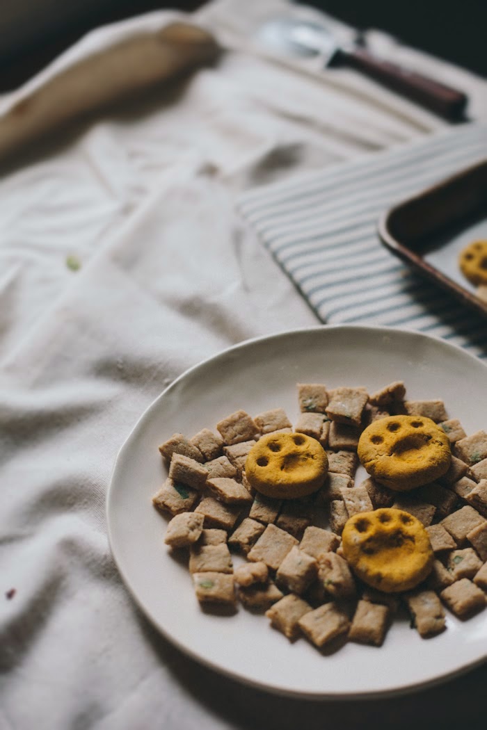 For the dog biscuits I used pumpkin and flax to bring some nutritional value to the biscuits, and crispy little pieces of bacon to make the taste worthwhile, and for the cat crisps I used cheddar to draw them in and tuna and parsley to provide a bit of greenery and protein. The treats were quite the success, and it felt really good to know exactly what was in the niblets I was feeding them. Also, I’ll just say it, the dog biscuits are adorable and I could have stared at them for a good long while going awwwwwwwww. I mean, seriously, look at them. Also, the face below. Awwwwwwwwwww.